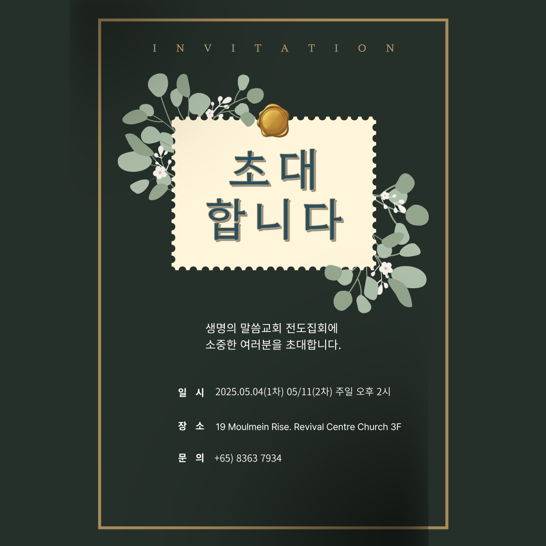 주소 : 19 Moulmein Rise Singapore 308134 (Revival Centre Church 3-4F)