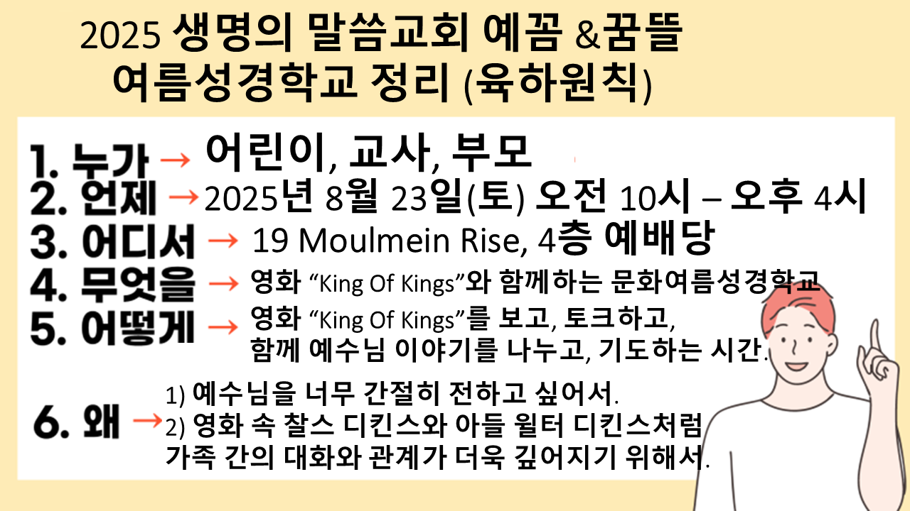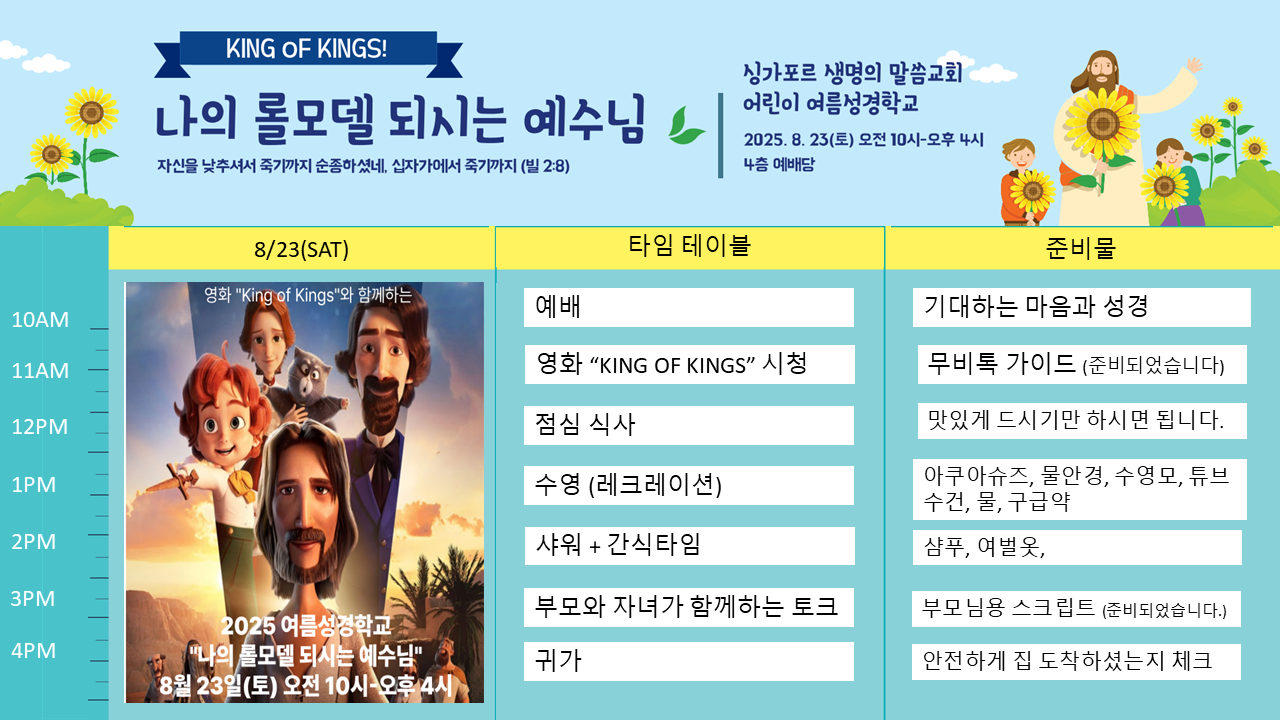 • 시간: 오전 9시 50분까지 아이들을 교회 4층 예배당으로 보내주세요.