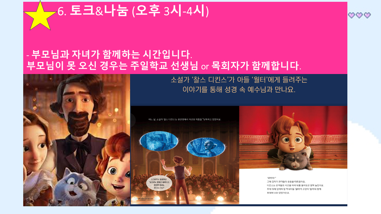 • 부모님과 함께 나누기 (예수님은 어떤 분이신지 나눔)은 오후 3시 20분 4층 예배당에서 시작됩니다.