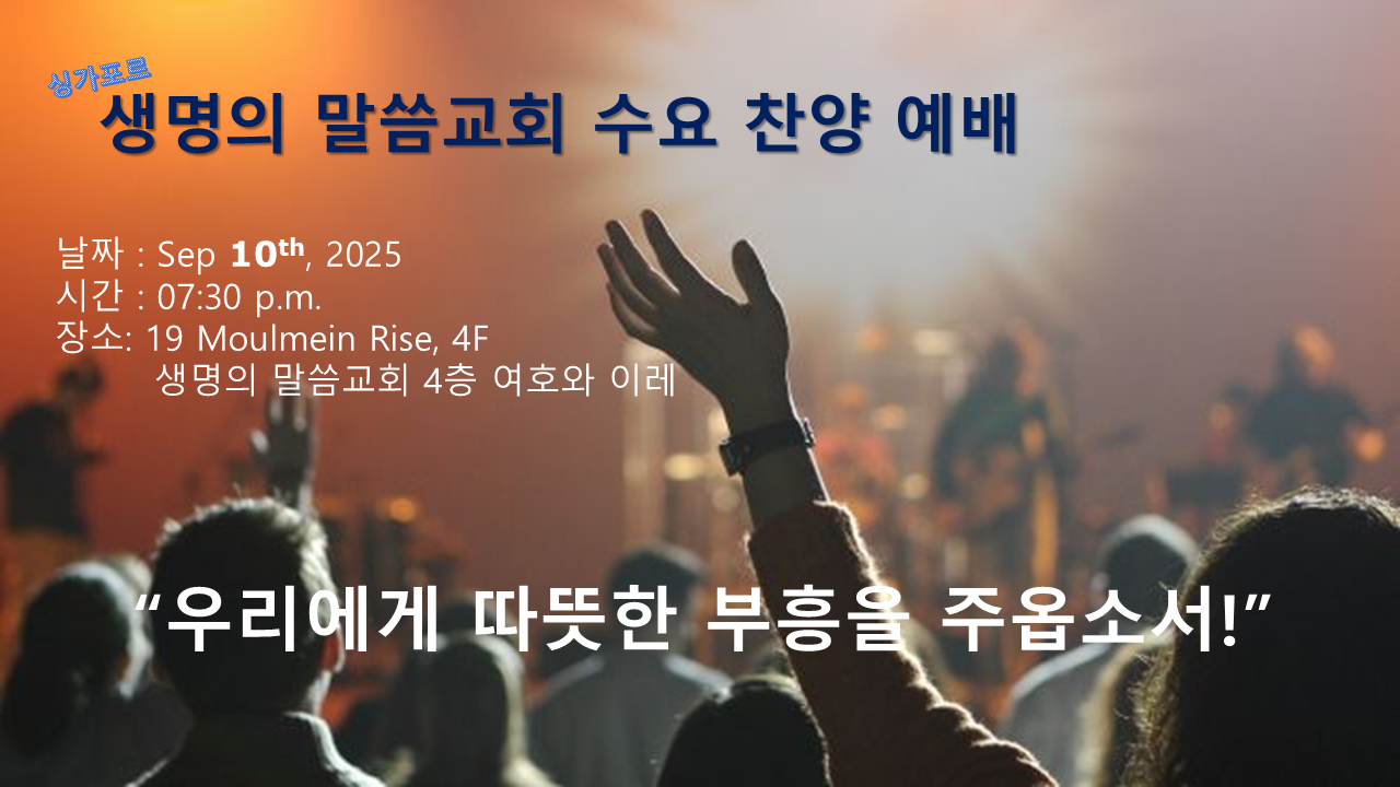 이번 주 9/10(수) 저녁 7시 30분 4층 여호와 이레에서 수요예배가 드려질 예정입니다.