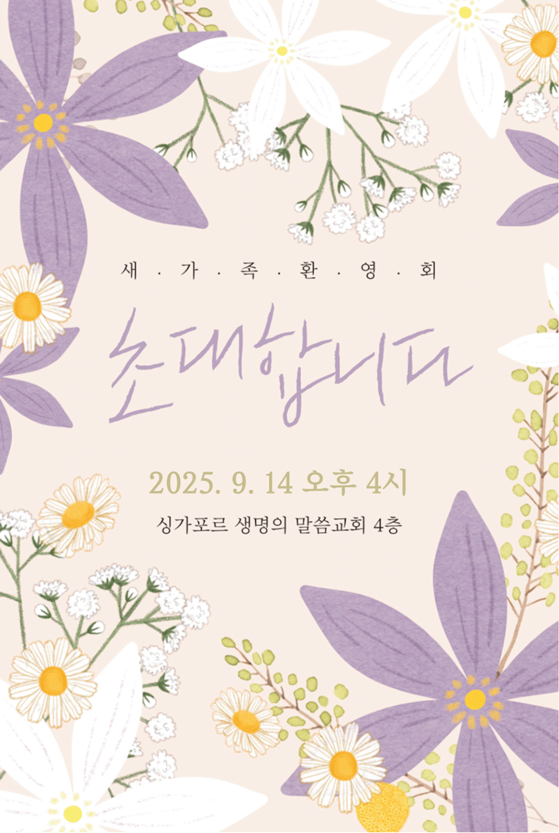 9/14 (주) 오후 4시에 4층 예배당에서 새가족 환영회가 열립니다.