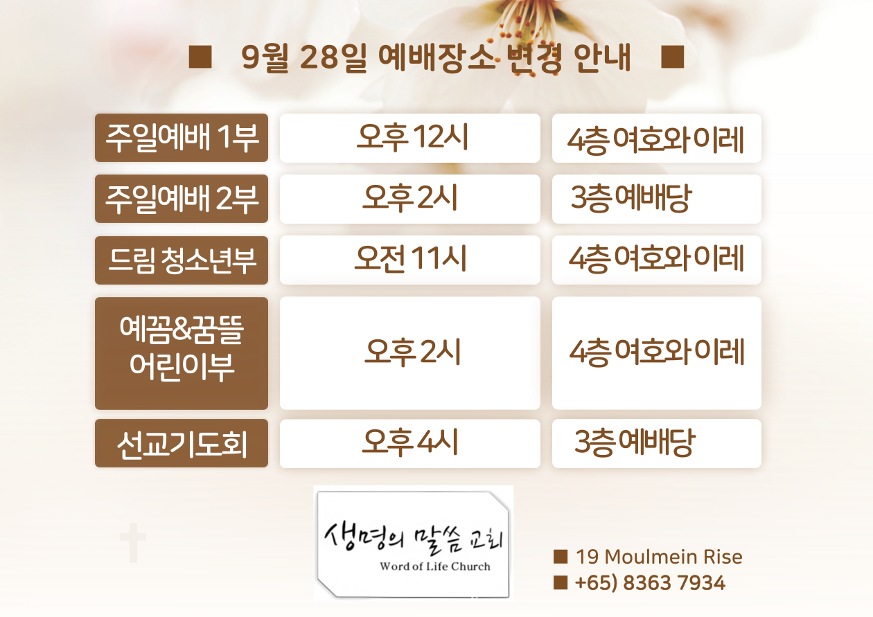 #4층 예배당 에어컨 수리로 인하여 내일 9/28(주) 1부 예배와 예꼼&꿈뜰 예배 장소와 선교 기도회 장소가 변경되어 진행될 예정입니다.