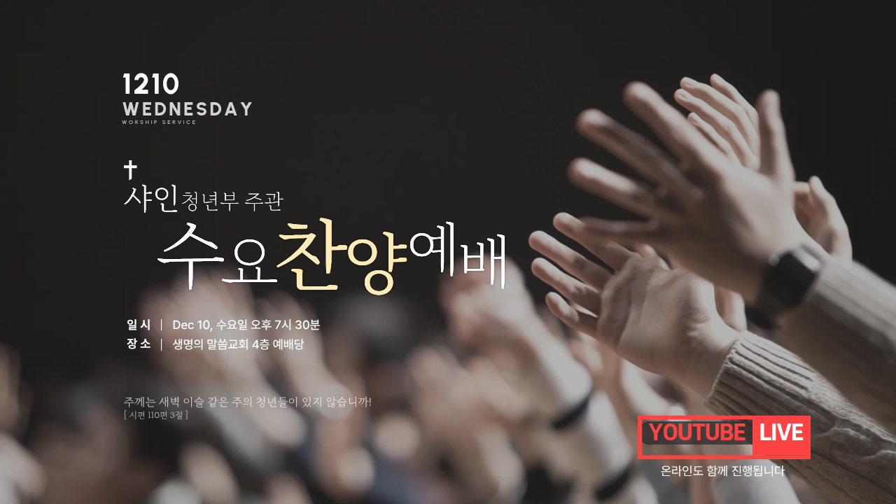 12/10 샤인 청년부 주관으로 수요찬양예배가 드려집니다.