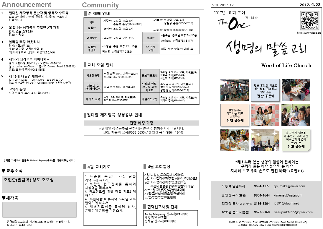 주소 : 19 Moulmein Rise Singapore 308134 (Revival Centre Church 3-4F)